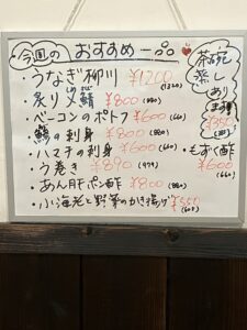 本日のおすすめ 2025-11-28 未分類 コメント こんばんは、うな美です! 今日のおすすめメニューはお魚が豊富。 お刺身や熱々のかき揚げ、茶碗蒸しなど お楽しみいただけます。 もちろん、美味しいうなぎも召し上がってくださいね♪ お待ちしております。 続きを読む
